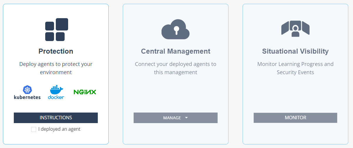 When logged in to the open-appsec portal, click on **Getting Started.** You will see this page: