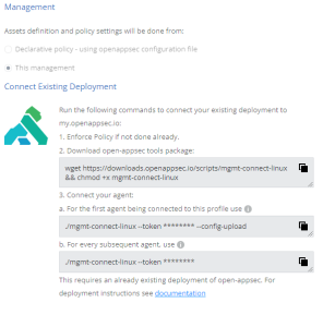 2. Copy the commands **as shown in the selected profile** and run it in your Kubernetes or Linux Environment to connect your deployed agents to this profile and the central management.\