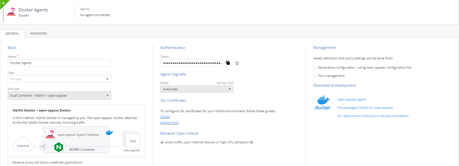 Follow the instructions provided here to install open-appsec, once those have been successfully performed the deployed open-appsec Agent will automatically connect to the  Profile created in the steps above, and after about two minutes, you will see a green notification bar in the Web UI.